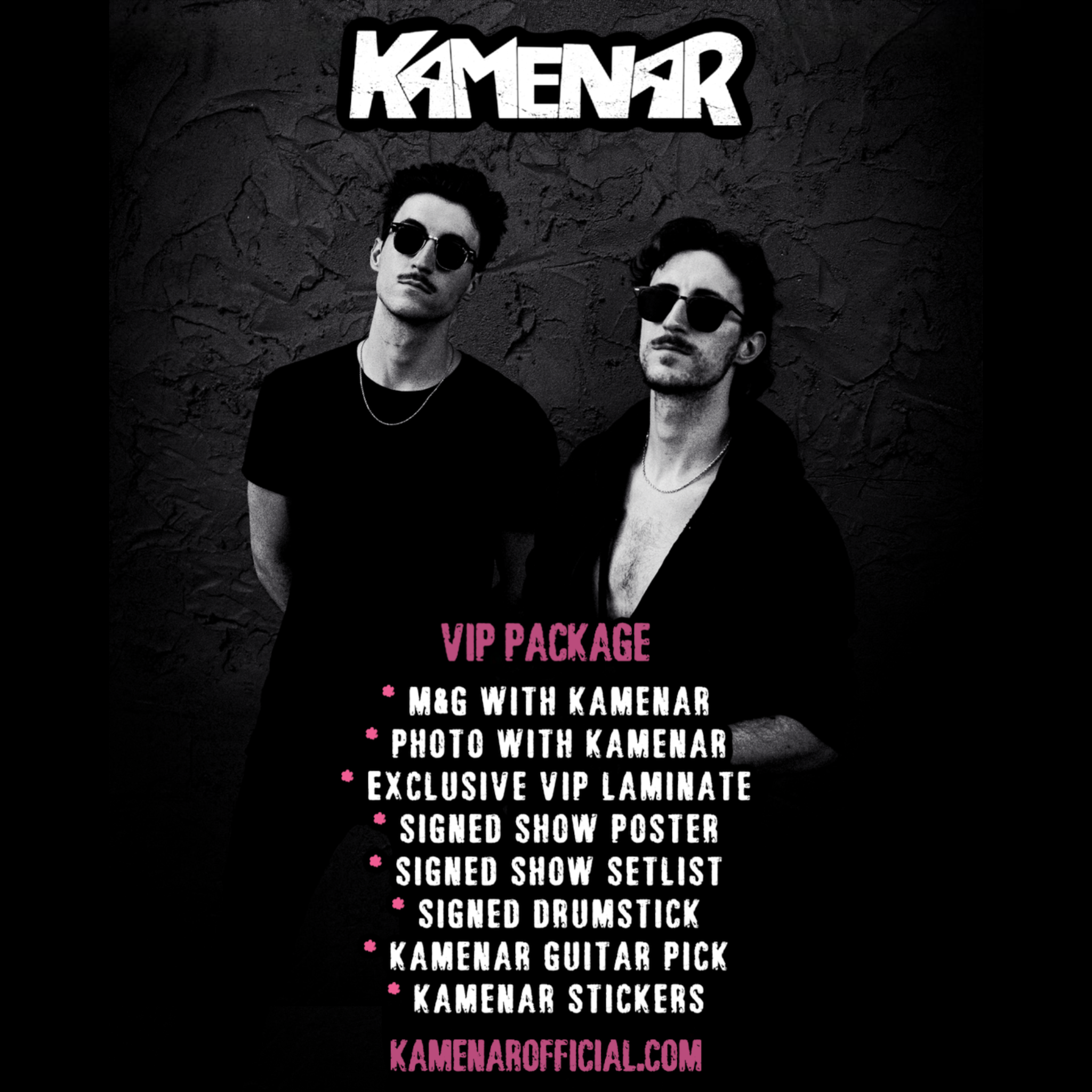 Signed Electric Guitar Sale Price: $225.00 Original Price: $250.00 Sale Signed Now That We Both Know CD $20.00 Signed Animal CD $20.00 VIP Package Sale Price: $40.00 Original Price: $50.00 Sale Kamenar Whisky A Go Go Tickets $35.00 Whisky A Go Go VIP Package (1/3/26) Sale Price: $65.00 Original Price: $85.00 Sale Zip Up Jacket from $45.00 Sale Animal Shirt from $35.00 Now That We Both Know Shirt from $35.00 Fast Times Tour Shirt from $35.00 Sale Fast Times Tour V-Neck from $35.00 Crazy Life Tour Shirt from $35.00 Sale No Way Back Tour Shirt from $35.00 Sale No Way Back Tour V-Neck from $35.00 The Road Dogz Tour Shirt from $35.00 Sale The Road Dogz Tour V-Neck from $35.00 Vinyl Shirt from $30.00 Vinyl V-Neck from $30.00 Hoodie from $40.00 Camouflage Hoodie from $40.00 Sale Fast Times Tour Hoodie from $40.00 Vinyl Hoodie from $40.00 Beanies $30.00 Hat $30.00 Camo Hat $30.00 Tie Dye Shirt from $30.00 Original Logo Tank Top from $30.00 Signed Self Titled CD Sale Price: $15.00 Original Price: $20.00 Sale Signed Tour Posters from $15.00 Sale Hand Drawn Drumhead $60.00 Signed Drumstick from $15.00 Sale Guitar Pick Earrings $20.00 Sold Out Stickers $5.00 Original Logo Shirt from $30.00 Original Logo V-Neck from $30.00